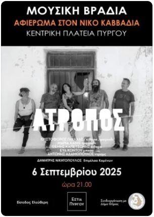 Στον ποιητή “των μακρυσμένων θαλασσών και των γαλάζιων πόντων” είναι αφιερωμένη η συναυλία από το μουσικό σύνολο “Άτροπος” που Διοργανώνεται από την Εστία Πύργου στην κεντρική πλατεία του χωριού στις 6 Σεπτεμβρίου , ώρα 21.00 με ελεύθερη είσοδο.