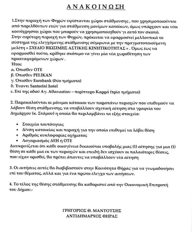 Ανακοίνωση Δήμου Θήρας με θέμα τις θέσεις πάρκινγκ για τους μόνιμους κατοίκους