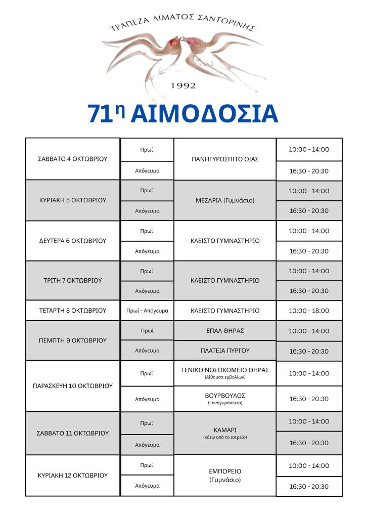 Η Τράπεζα Αίματος Σαντορίνης διοργανώνει την 71η εθελοντική αιμοδοσία που θα πραγματοποιηθεί 4 -12 Οκτωβρίου, σε συνεργασία με το κλιμάκιο αιμοδοσίας του νοσοκομείου Παίδων Αγ. Σοφία και απευθύνει ανοιχτό κάλεσμα για συμμετοχή σε αυτήν.