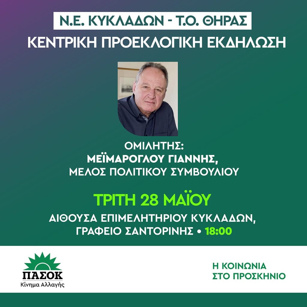 Αύριο Τρίτη 28 Μαίου η κεντρική προεκλογική συγκέντρωση του ΠΑΣΟΚ στην Σαντορίνη 744 Views 27 Μαΐου, 2024 Σαντορίνη thira
