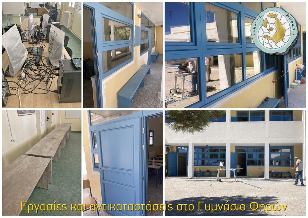 Οι εργασίες των συνεργείων του Δήμου Θήρας, υπό την εποπτεία του Προέδρου της Σχολικής Επιτροπής Δευτεροβάθμιας Εκπαίδευσης κ. Δημήτρη Σιγάλα, συνεχίζονται ώστε να είναι έτοιμα τα σχολεία να υποδεχτούν τους μαθητές για τη νέα σχολική χρονιά που ξεκινά σε λίγες μέρες.