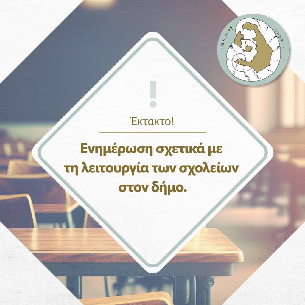 Ο Δήμος Θήρας ενημερώνει ότι λόγω της επικείμενης κακοκαιρίας (θυελλώδεις άνεμοι 9-10 μποφόρ) αποφασίζει την αναστολή της λειτουργίας των σχολικών μονάδων Πρωτοβάθμιας και Δευτεροβάθμιας εκπαίδευσης καθώς και των Δημοτικών Βρεφονηπιακών Σταθμών του Δήμου Θήρας για την Τρίτη 30 Ιανουαρίου 2024 ως μέτρο πρόληψης και προστασίας της ασφάλειας των μαθητών, των συνοδών και των εκπαιδευτικών.