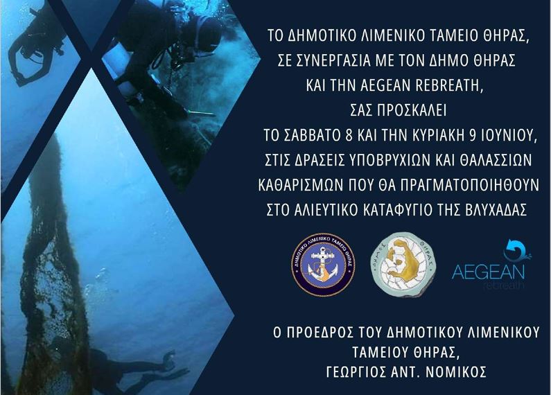 Το Δημοτικό Λιμενικό Ταμείο Θήρας ενόψει της Παγκόσμιας Ημέρας Περιβάλλοντος σας προσκαλεί να συμμετέχετε ενεργά στη δράση που θα γίνει στο Αλιευτικό Καταφύγιο Βλυχάδας, ν. Θήρας. Συγκεκριμένα, οι δράσεις υποβρύχιων και παράκτιων καθαρισμών ξεκινούν το Σάββατο 8 Ιουνίου στο λιμανάκι της Βλυχάδας και θα διαρκέσουν όλο το Σαββατοκύριακο. Το Δημοτικό Λιμενικό Ταμείο Θήρας, σε συνεργασία με την Aegean Rebreath, το Δήμο Θήρας και ομάδα 28 περίπου εθελοντών, θα βρίσκονται στο αλιευτικό καταφύγιο της Βλυχάδας για τις ετήσιες, διευρυμένες περιβαλλοντικές δράσεις προστασίας του θαλάσσιου περιβάλλοντος. Συγκεκριμένα, το Σάββατο 8 Ιουνίου από τις 09:30 έως τις 18:00 και την Κυριακή 9 Ιουνίου από τις 09:00 έως τη 13:00, θα πραγματοποιηθούν υποβρύχιοι εθελοντικοί καθαρισμοί στο αλιευτικό καταφύγιο της Βλυχάδας και εκτενής χαρτογράφηση και εντοπισμός επιβαρυμένων ζωνών της περιοχής. Παράλληλα, το Σάββατο 8 Ιουνίου από τις 11:00 έως τις 19:00 θα υλοποιηθεί αποστολή ανέλκυσης εγκαταλελειμμένων διχτυών στα ανοιχτά της Θηρασιάς, εκτενής χαρτογράφηση και εντοπισμός επιβαρυμένων ζωνών της περιοχής κατάδυσης. Επιπρόσθετα, την Πέμπτη 6 Ιουνίου από τις 09:00 έως τη 13:00 και το Σάββατο 4 Ιουνίου από τις 11:00 έως τη 13:00 θα πραγματοποιεί δράση εκπαίδευσης για τους μαθητές.