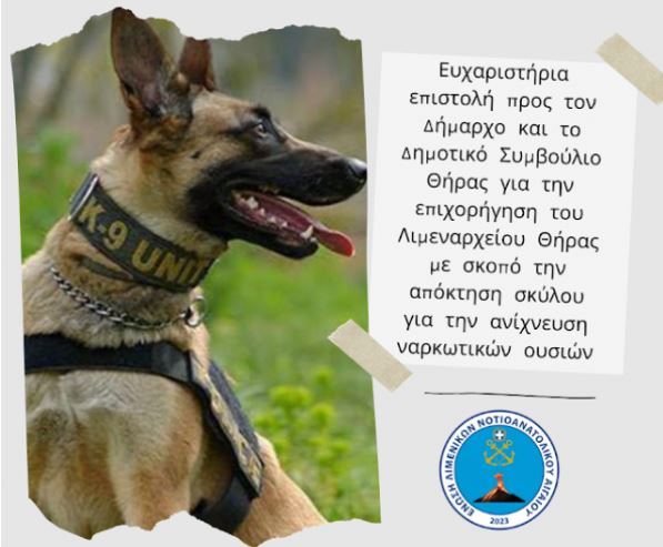 Με την παρούσα επιστολή μας θέλουμε να εκφράσουμε τις ευχαριστίες μας στον Δήμαρχο Θήρας κ. Ζώρζο Νικόλαο και στο Δημοτικό Συμβούλιο Θήρας, διότι σε πρόσφατη συνεδρίαση του ψήφισαν ομόφωνα για την επιχορήγηση του Λιμεναρχείου Θήρας με σκοπό την απόκτηση σκύλου για την ανίχνευση ναρκωτικών ουσιών – Κ9 . Κατόπιν συναντήσεων του σωματείου μας (εδώ και εδώ) με τον κ. Ζώρζο Νικόλαο είχε ζητηθεί η αγορά σκύλου Κ9 αμέσως μετά την ανάληψη των καθηκόντων του.