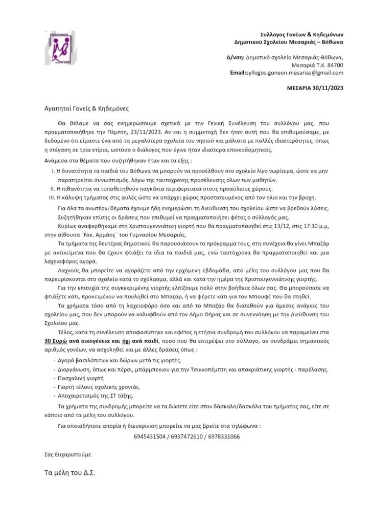Ενημέρωση Συλλόγου Γονέων και κηδεμόνων δημοτικού σχολείου Μεσαριάς-Βόθωνα 598 Views 02 Δεκεμβρίου, 2023 Σαντορίνη thira