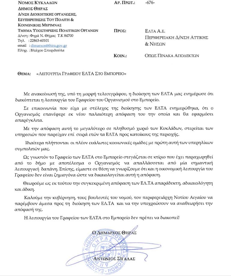 Επιστολή Δήμαρχου Θήρας για το θέμα της κατάργησης του Ταχυδρομείου στο Εμπορείο 488 Views 19 Οκτωβρίου, 2023 Σαντορίνη thira