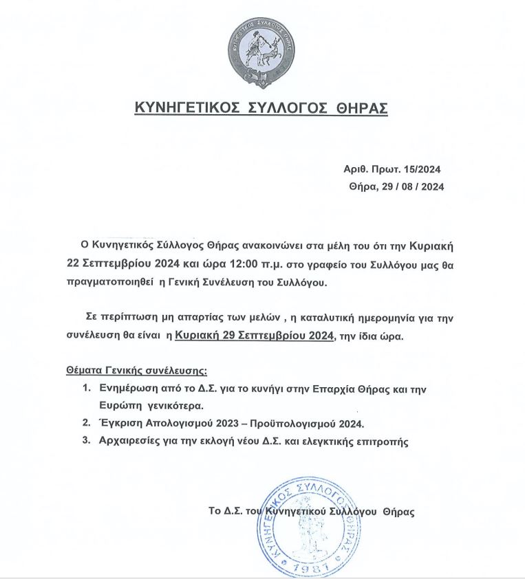Γ.Σ και εκλογές στον Κηνηγετικό Σύλλογο Θήρας