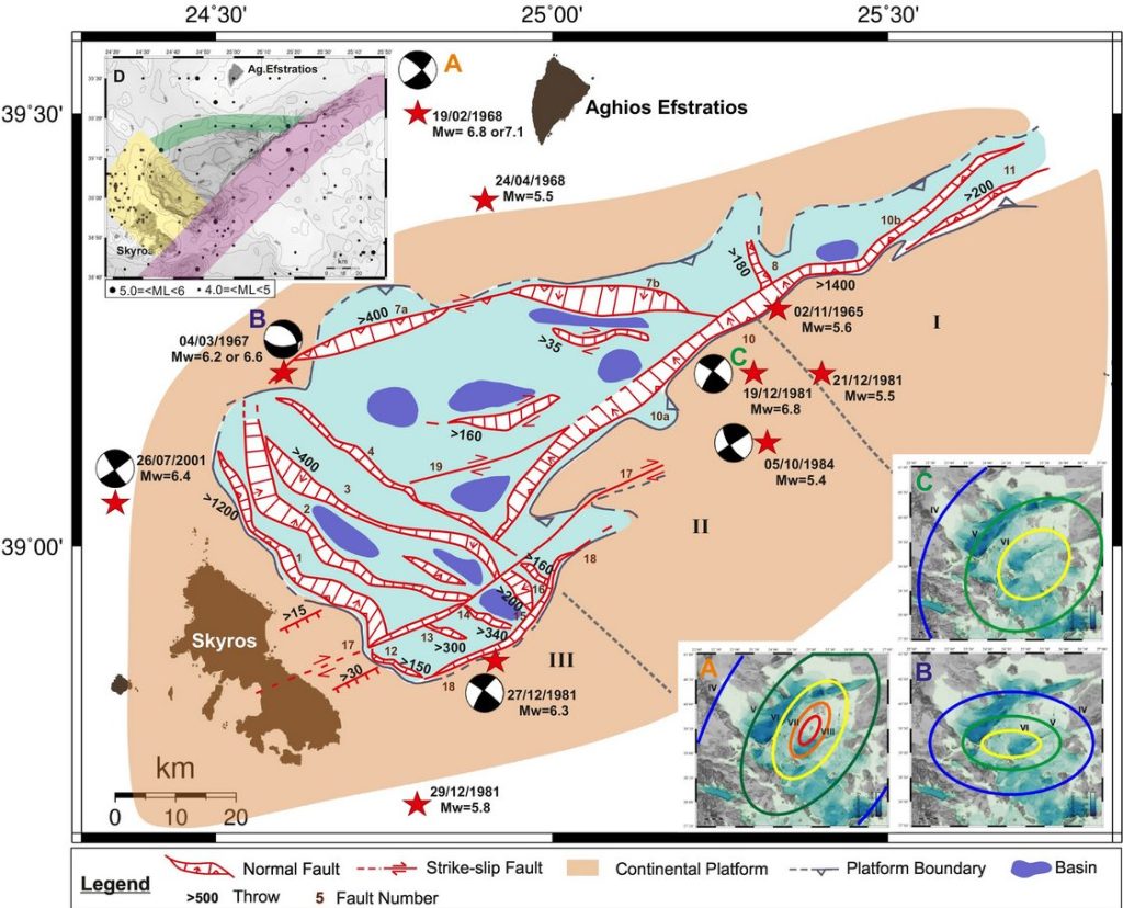 Με αφορμή τον σεισμό που έγινε πριν λίγα λεπτά στο θαλάσσιο χώρο ΒΔ της Σκύρου, σε μία ενεργή περιοχή που το 2001 έδωσε σεισμό 6,4R, είχαμε τονίσει στα συμπεράσματα της δημοσίευσης “Active tectonics and seismic hazard in Skyros Basin, North Aegean Sea, Greece” από Papanikolaou et al., 2019 (Marine Geology) ότι:“Το γεγονός του 2001 με μέγεθος M = 6,4 σημειώθηκε σε μία αριστερόστροφη (sinistral) υποθαλάσσια ρήξη με διεύθυνση ΒΔ–ΝΑ, λίγα χιλιόμετρα βορειοδυτικά της λεκάνης της Σκύρου. Πρόκειται για τον πρώτο καταγεγραμμένο μηχανισμό γέννεσης που ενεργοποιεί ρήγμα με διεύθυνση ΒΔ–ΝΑ στο Βόρειο Αιγαίο, επιβεβαιώνοντας ότι αυτά τα ρήγματα παραμένουν ενεργά. Τέσσερα παράλληλα ρήγματα με ίδια διεύθυνση, τα οποία μπορούν να προκαλέσουν σεισμούς μεγέθους M ≥ 7,0, έχουν εντοπιστεί υποθαλάσσια προς τα ανατολικά του νησιού της Σκύρου.