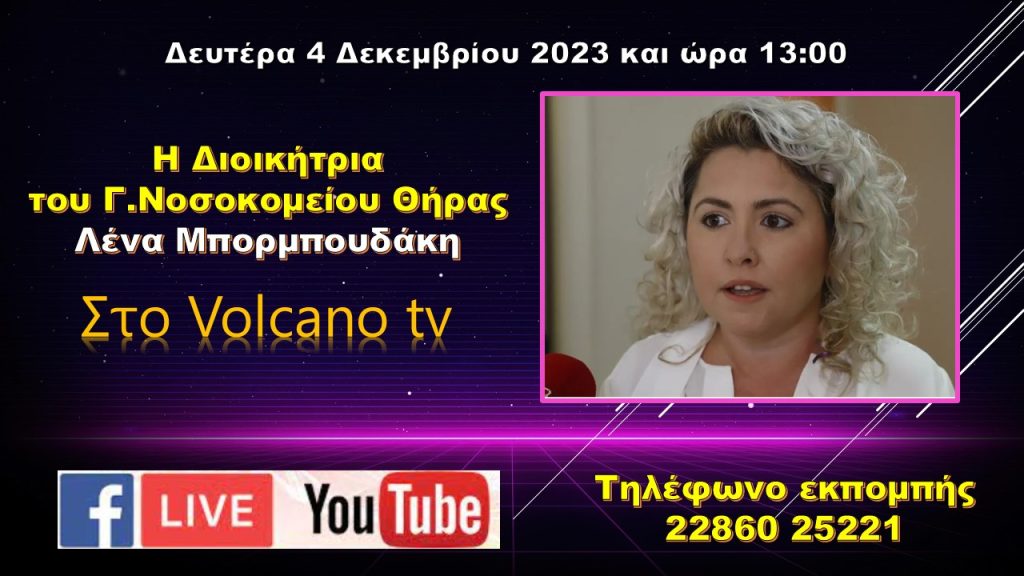 Η Λένα Μπορμπουδάκη εφ όλης της ύλης στο Volcano tv την Δευτέρα 4 Δεκεμβρίου 414 Views 02 Δεκεμβρίου, 2023 Σαντορίνη thira