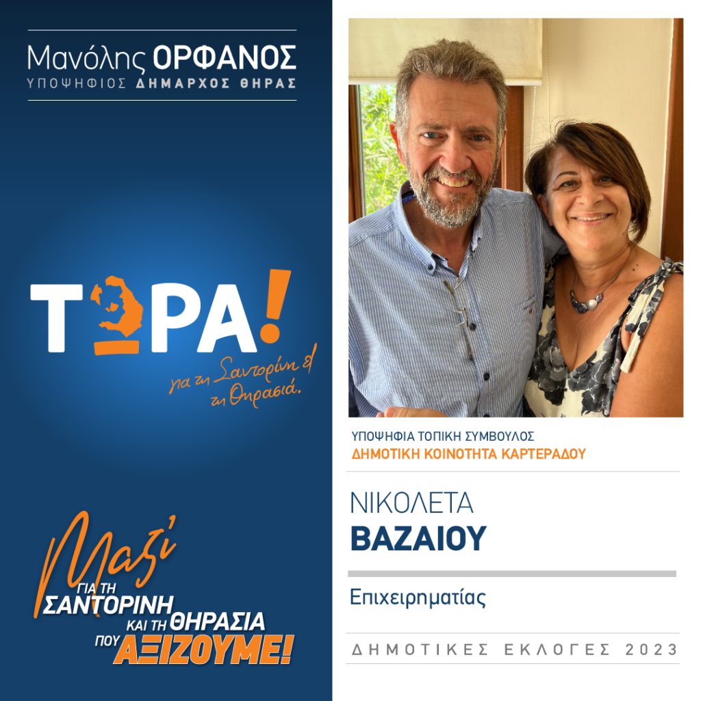 «Εμπιστεύομαι τον Μανόλη Ορφανό, τόσο σαν άνθρωπο, αλλά πλέον και ως επιτυχημένο αυτοδιοικητικό! Μόνο εκείνος μπορεί να πάει τη Σαντορίνη μπροστά! Όλους τους υπόλοιπους τους είδαμε. ..! Ήρθε ο καιρός να αναλάβουν οι δραστήριοι και αποτελεσματικοί!»