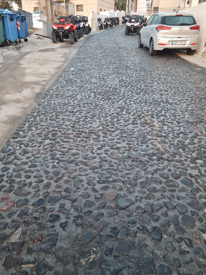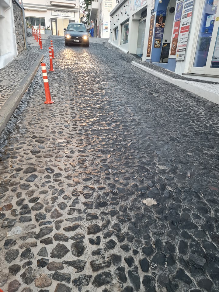 Συγκεκριμένα πλύθηκαν οι δρόμοι και τα πλακόστρωτα της πλατείας Φηρών, των καθέτων οδών καθώς και ο δρόμος από την Μητρόπολη μέχρι το Μουσείο Προϊστορικής Θήρας.