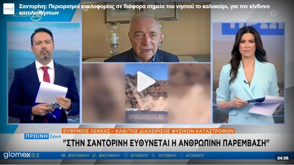 Τον κώδωνα του κινδύνου για τη Σαντορίνη, έκρουσε ο καθηγητής διαχείρισης φυσικών καταστροφών στο ΕΚΠΑ, Ευθύμης Λέκκας, μιλώντας στο Action 24, μετά την κοινή υπουργική απόφαση που εκδόθηκε για την εφαρμογή περιορισμών κυκλοφορίας σε συγκεκριμένα σημεία του νησιού μετά τα πρόσφατα φαινόμενα κατολισθήσεων.