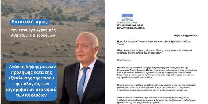 Σε συνέχεια της επιστολής του Προέδρου της Ένωσης Φιλωτιτών Νάξου, Βασίλη Κρασσά, την Πέμπτη 6 Νοεμβρίου απέστειλα επιστολή προς τον Υπουργό Αγροτικής Ανάπτυξης & Τροφίμων, ζητώντας την άμεση λήψη μέτρων πρόληψης για την προστασία του ζωικού κεφαλαίου από την ευλογιά των αιγοπροβάτων στα νησιά των Κυκλάδων.Η έγκαιρη κινητοποίηση και πρόληψη είναι απαραίτητες για τη στήριξη των κτηνοτρόφων μας και της τοπικής παραγωγής.