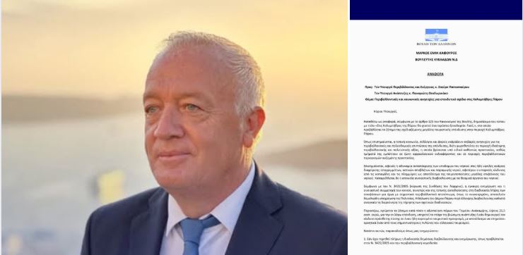 Σήμερα κατέθεσα αναφορά προς τον Υπουργό Περιβάλλοντος & Ενέργειας και τον Υπουργό Ανάπτυξης, μεταφέροντας τις έντονες ανησυχίες της τοπικής κοινωνίας για τη σχεδιαζόμενη τουριστική επένδυση στις Κολυμπήθρες της Πάρου.Η ανάπτυξη είναι απαραίτητη για τα νησιά μας, αλλά πρέπει να γίνεται με σεβασμό στο περιβάλλον, στην πολιτιστική μας κληρονομιά και στις αντοχές των τοπικών υποδομών.