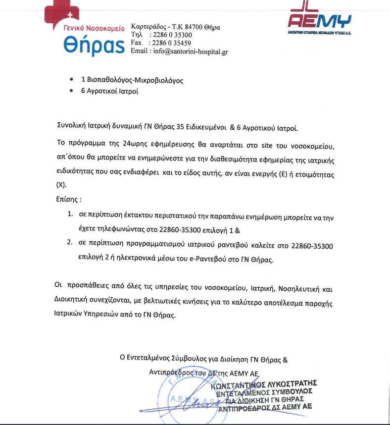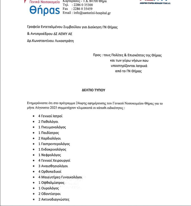 Με 35 ειδικευμένους γιατρούς και 6 αγροτικούς λειτουργεί το γενικό Νοσοκομείο Θήρας – Ανακοίνωση της ΑΕΜΥ 590 Views 02 Αυγούστου, 2025 Κυκλάδες, Σαντορίνη thira