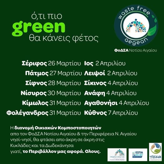 Με στόχο ένα πιο καθαρό και βιώσιμο περιβάλλον για τα νησιά μας, συνεχίζεται η δράση διανομής οικιακών κομποστοποιητών από τον ΦοΔΣΑ Νοτίου Αιγαίου σε συνεργασία με την Περιφέρεια Νοτίου Αιγαίου.Καλούμε τους κατοίκους της Φολεγάνδρου, της Ίου, της Σικίνου και της Ανάφης να προσέλθουν στα σημεία που έχουν υποδειχθεί, προκειμένου να παραλάβουν τον οικιακό τους κομποστοποιητή.