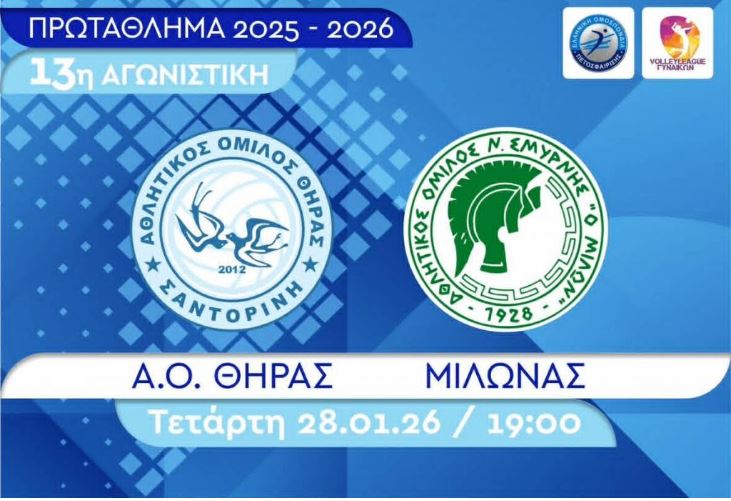 Τετάρτη 28 Ιανουαρίου 2026 Γυμναστήριο ΔΑΠΠΟΣ Σαντορίνη, 19.00 ( YouTube aothiras): Α.Ο. Θήρας – Α.Ο.Ν.Σ. Μίλων Διαιτητές: Γεωργάκη, Λιδωρικιώτη, Παρατηρητής: Ανδρονικίδης, Επόπτες: Πεσίνογλου, Κατρατσιώτη, Γραμματεία: Τζαννέτου.