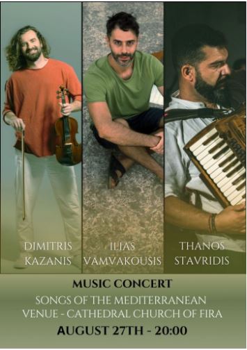 Την Τετάρτη 27 Αυγούστου στις 20:00 θα πραγματοποιηθεί στον κεντρικό πεζόδρομο των Φηρών, μπροστά από τον μητροπολιτικό ναό, μια μουσική παράσταση αφιερωμένη στον γήινο, αυθεντικό ήχο της Μεσογείου και της ελληνικής παράδοσης.