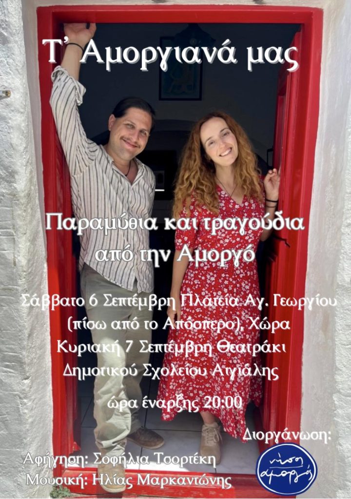 Παραμύθια και τραγούδια, σκοπούς και ιστορίες από την Αμοργό θα αφηγηθεί η Σοφήλια Τσορτέκη με την μουσική συνοδεία του Ηλία Μαρκαντώνη.