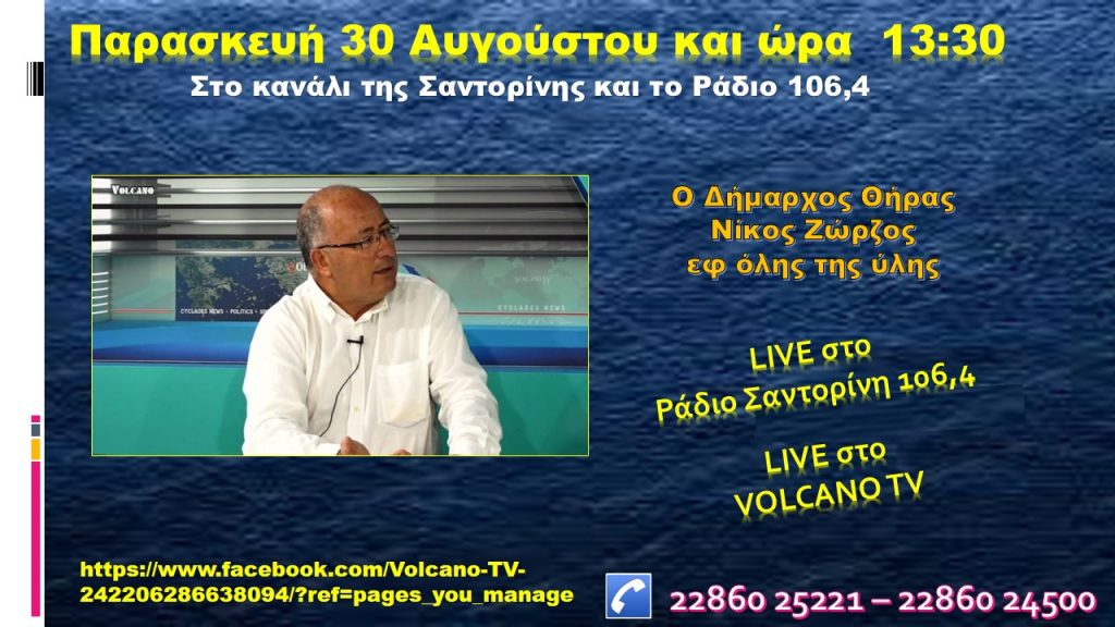 Ο Δήμαρχος Θήρας Ν.Ζώρζος στο κανάλι της Σαντορίνης την Παρασκευή 28-8-2024 431 Views 28 Αυγούστου, 2024 Σαντορίνη thira