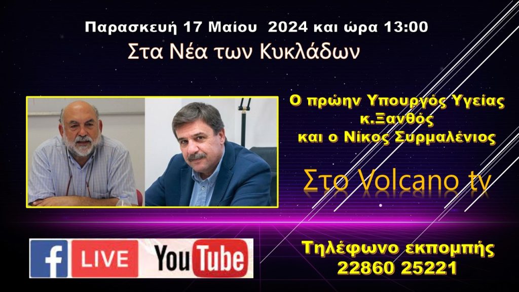 O πρώην Υπουργός υγείας κ.Ξανθός και ο Νίκος Συρμαλένιος στο Volcano tv 638 Views 16 Μαΐου, 2024 Σαντορίνη thira