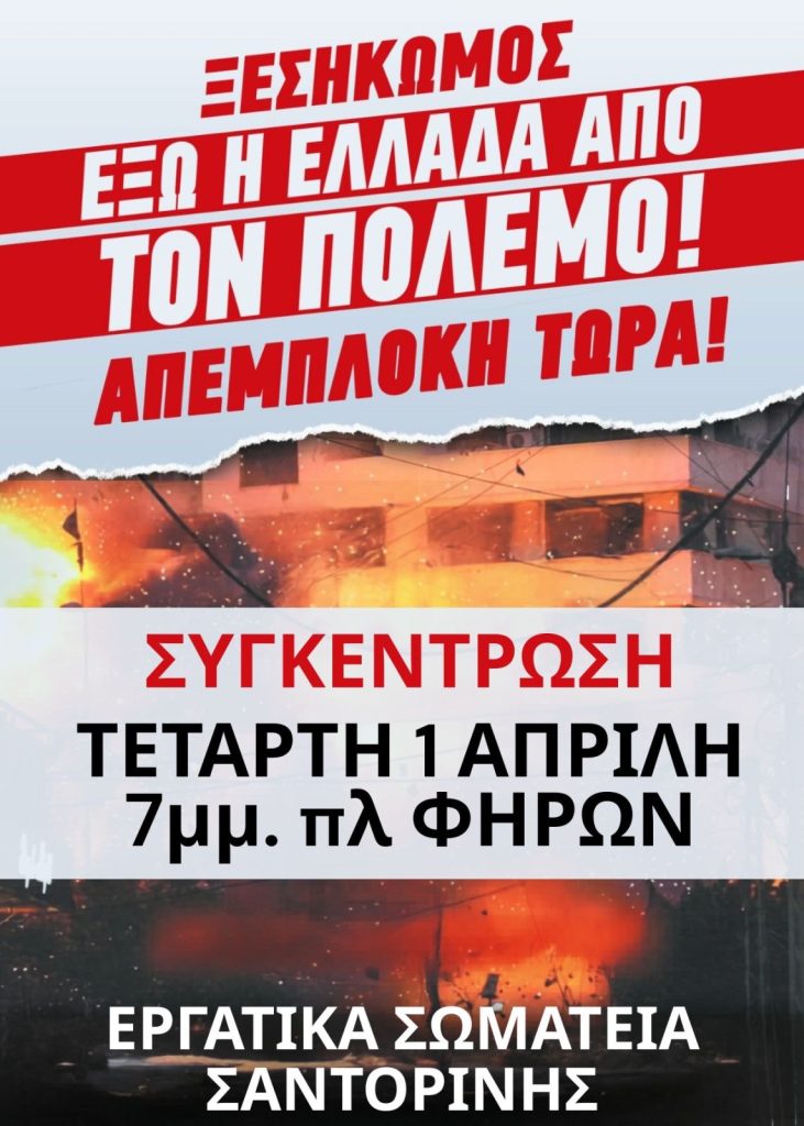 Σε συγκέντρωση διαμαρτυρίας για τον πόλεμο στη Μέση Ανατολή καλεί ο  ΣΥΛΛΟΓΟΣ ΕΡΓΑΖΟΜΕΝΩΝ του ΔΗΜΟΥ ΘΗΡΑΣ και στην ανακοίνωσή του αναφέρει τα ακόλουθα: