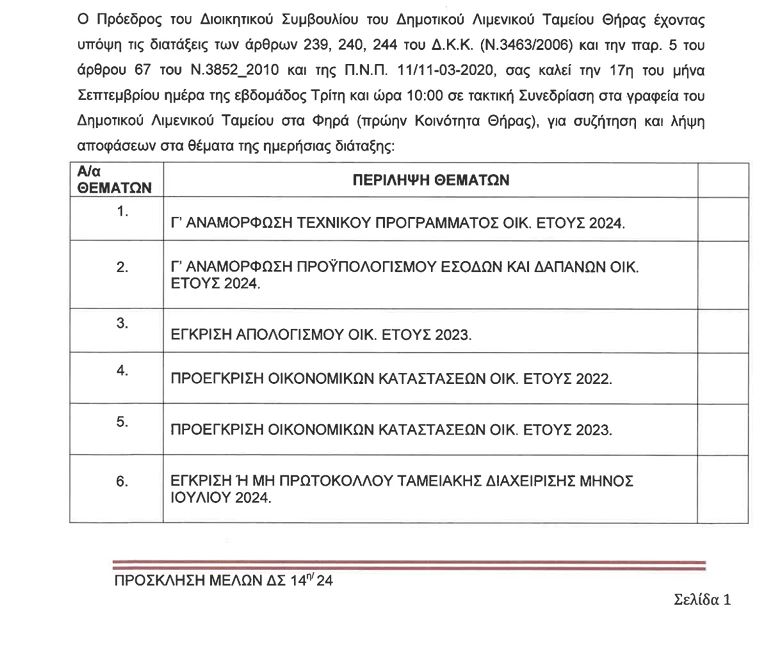 Συνεδριάζει την Τρίτη 17 Σεπτεμβρίου το ΔΣ του Δημοτικού Λιμενικού Ταμείου Θήρας 155 Views 15 Σεπτεμβρίου, 2024 Σαντορίνη thira