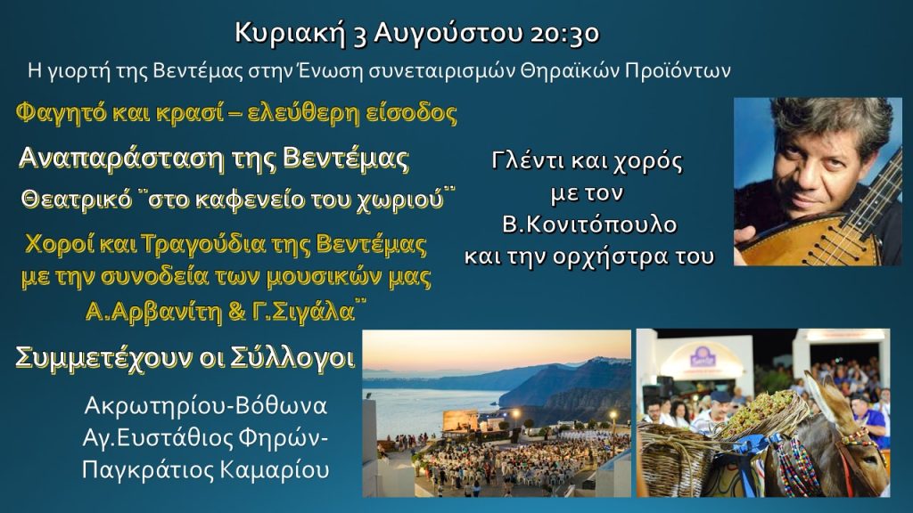 Την Κυριακή 3 Αυγούστου η Γιορτή της Βεντέμας 149 Views 28 Ιουλίου, 2025 Κυκλάδες, Πολιτισμός, Σαντορίνη thira