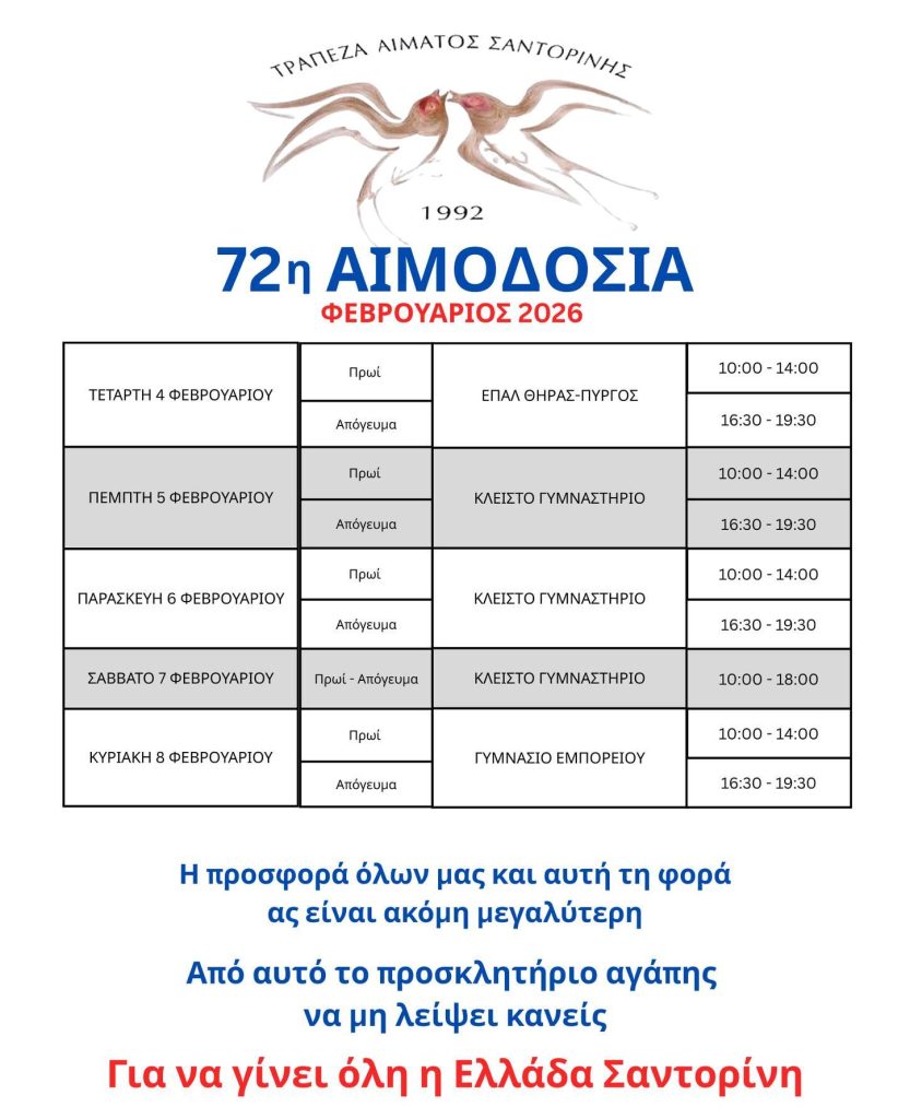 Το πρόγραμμα της 72ης Αιμοδοσίας της Τράπεζας Αίματος Σαντορίνης! 14 Views 23 Ιανουαρίου, 2026 Κυκλάδες, Σαντορίνη thira Ανακοινώνουμε το πρόγραμμα της 72ης Αιμοδοσίας της Τράπεζας Αίματος Σαντορίνης! Η προσφορά όλων μας και αυτή τη φορά ας είναι ακόμη μεγαλύτερη. Από αυτό το προσκλητήριο αγάπης ας μη λείψει κανείς. Για να γίνει όλη η Ελλάδα Σαντορίνη