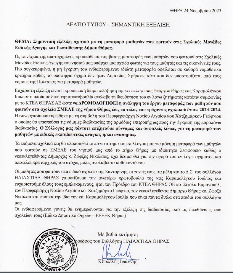 Βρέθηκε λύση για το σχολικό λεωφορείο των μαθητών των Ειδικών Σχολείων του νησιού.